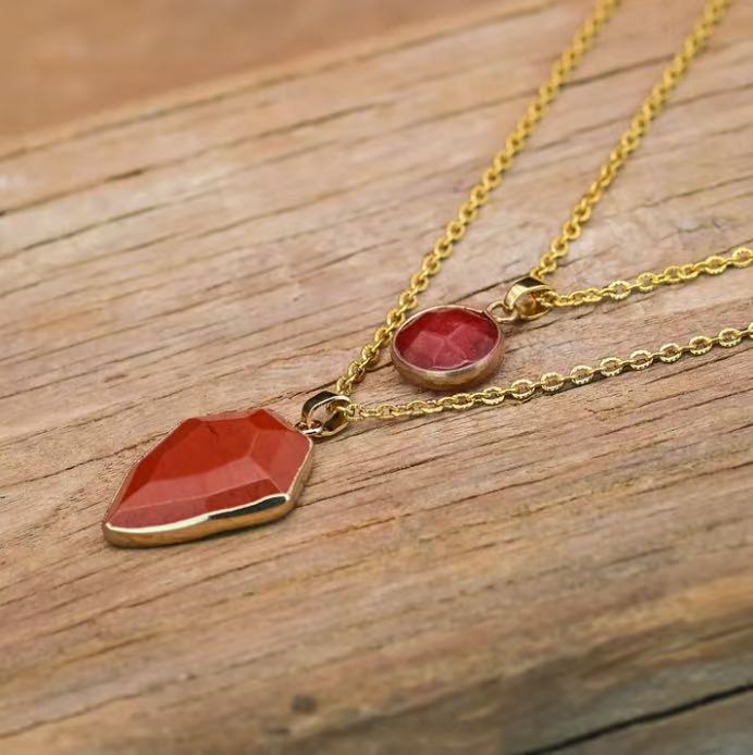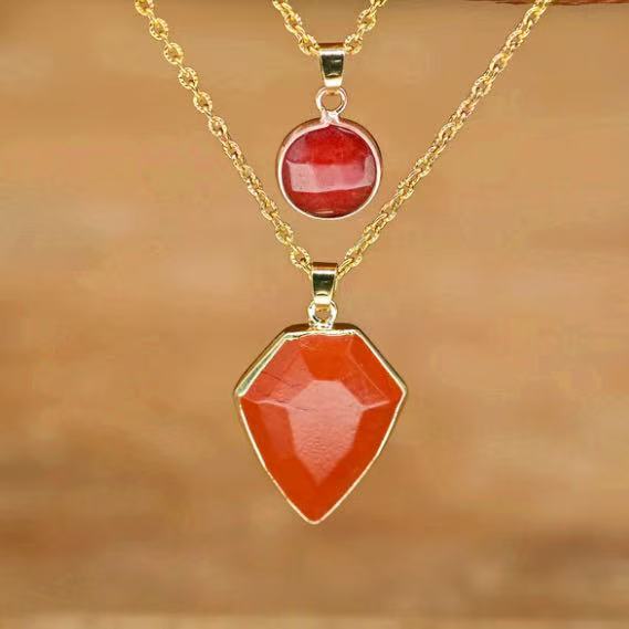 Fashionable Rhombus-shaped Teardrop Necklace With Red Inlaid Stones