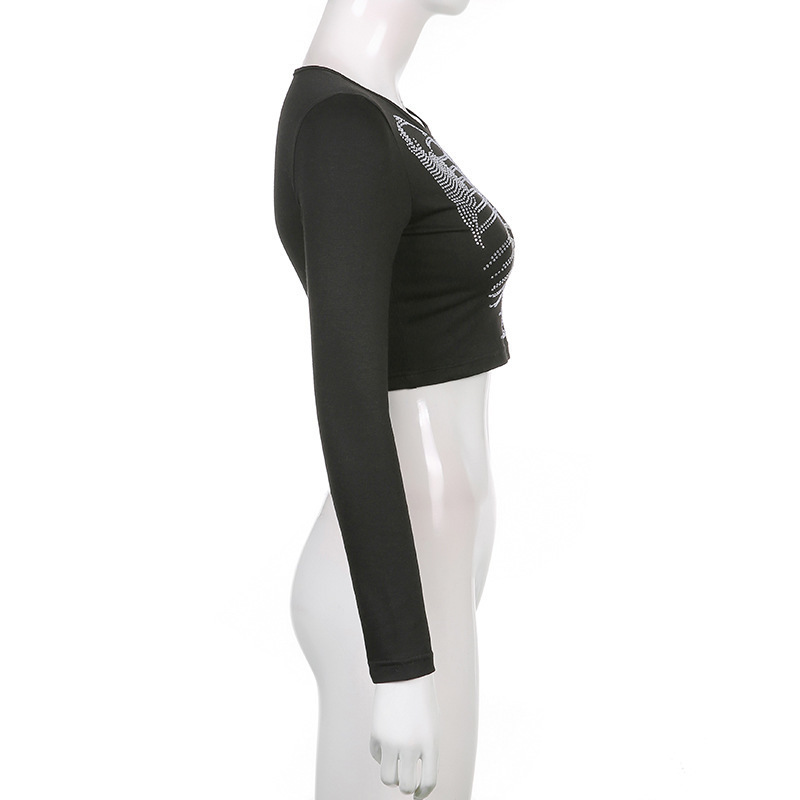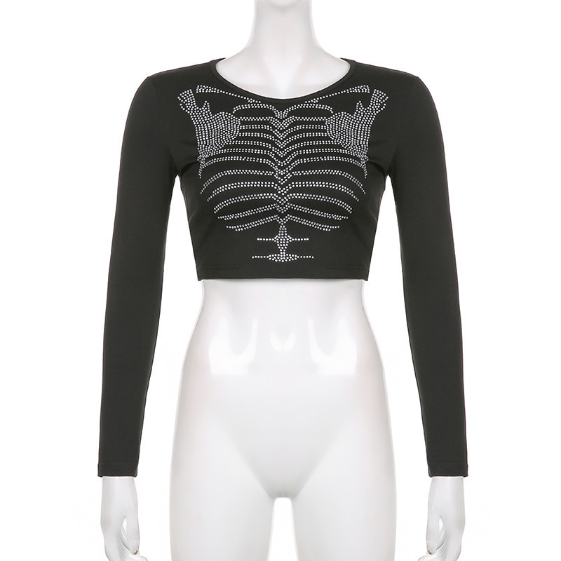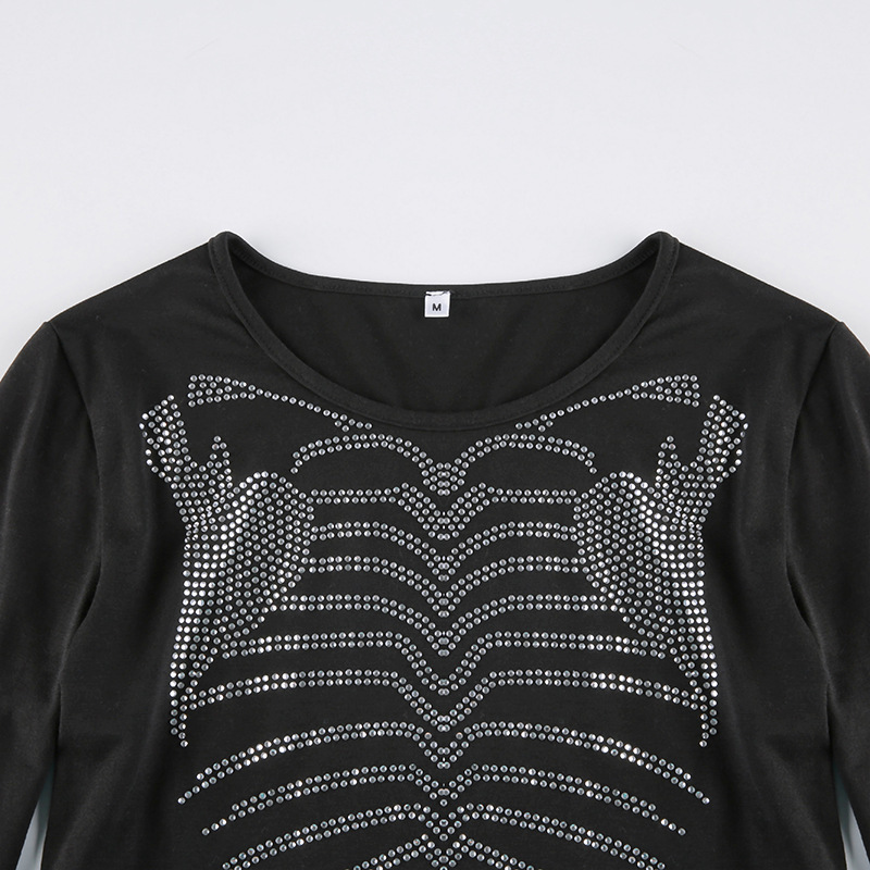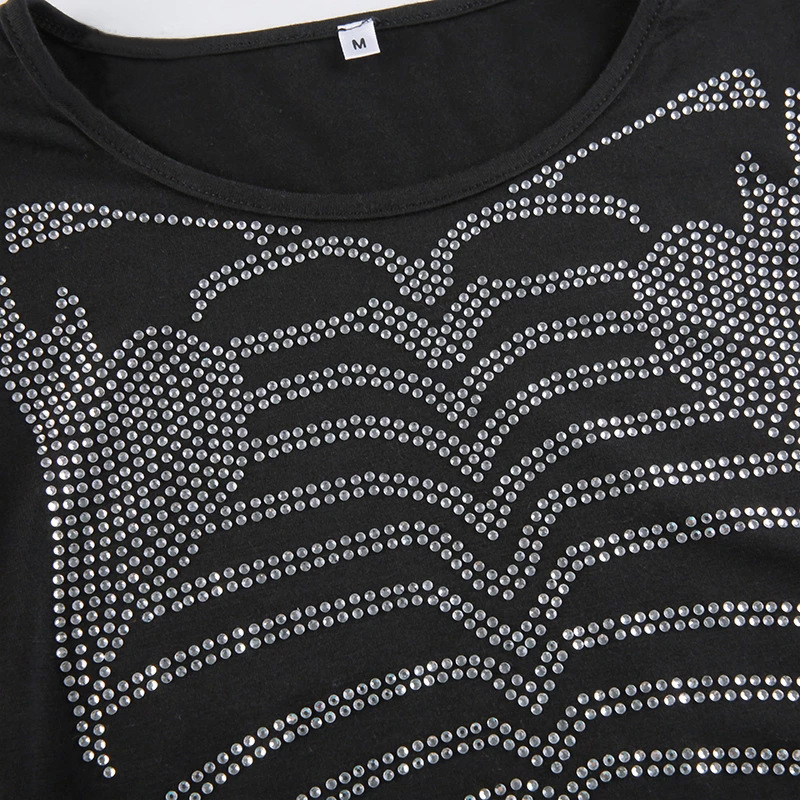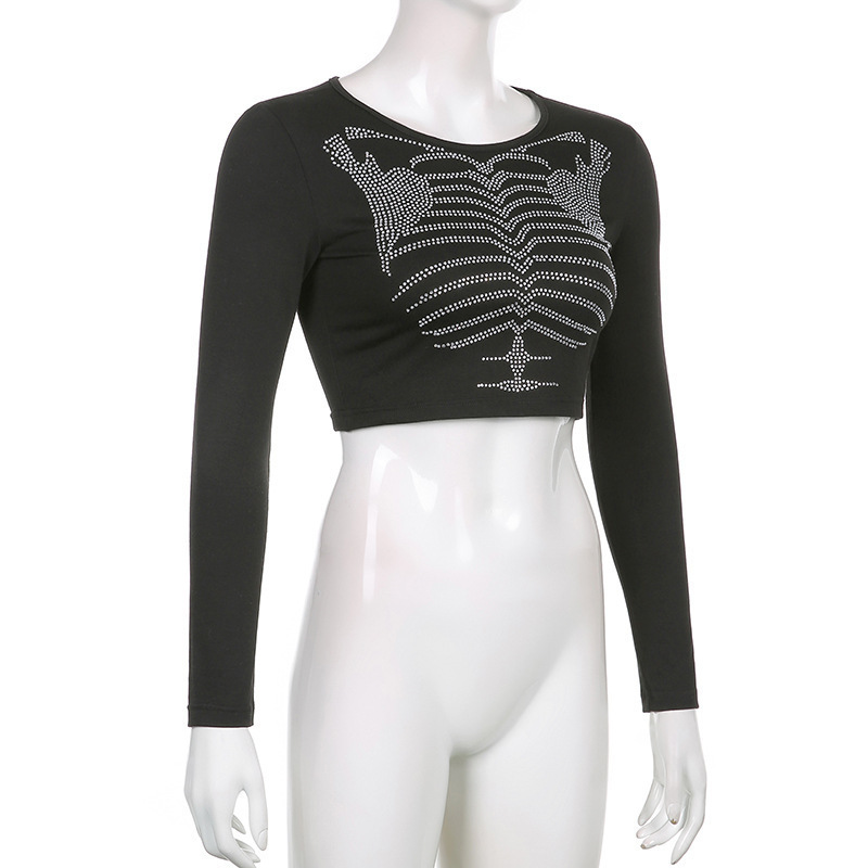 Skeleton-Design Rhinestone Crop Top Dark-Style Womens Pullover T-Shirt