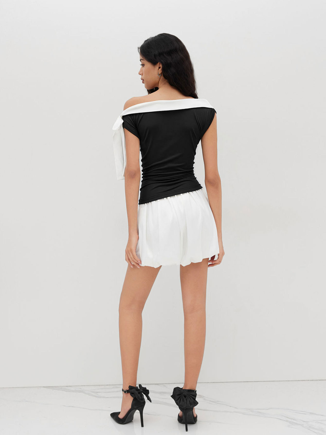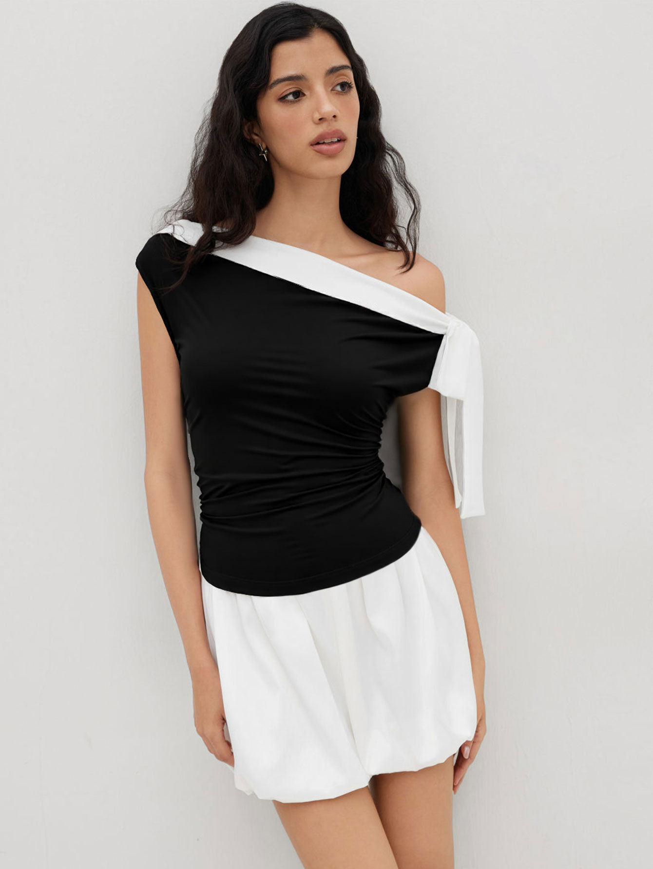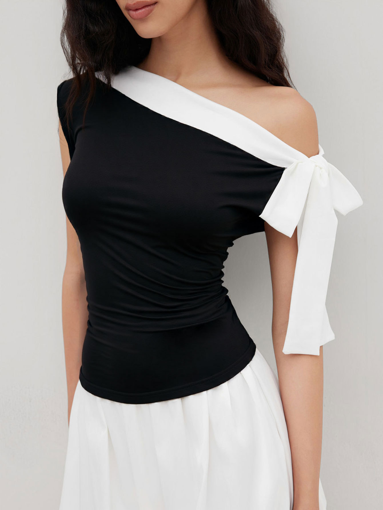 Womens Color-Block Slim-Fit Off-Shoulder Bow-Tie Neck Sleeveless Top