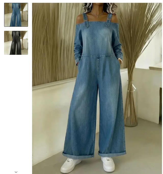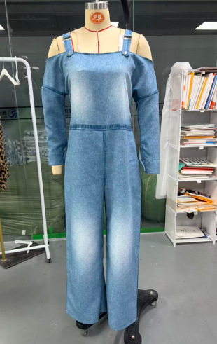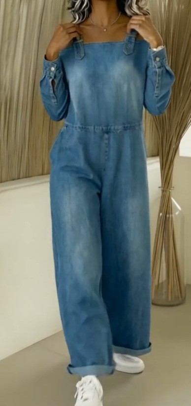 Womens Denim Printed Long-Sleeve Loose Casual Jumpsuit With Pockets